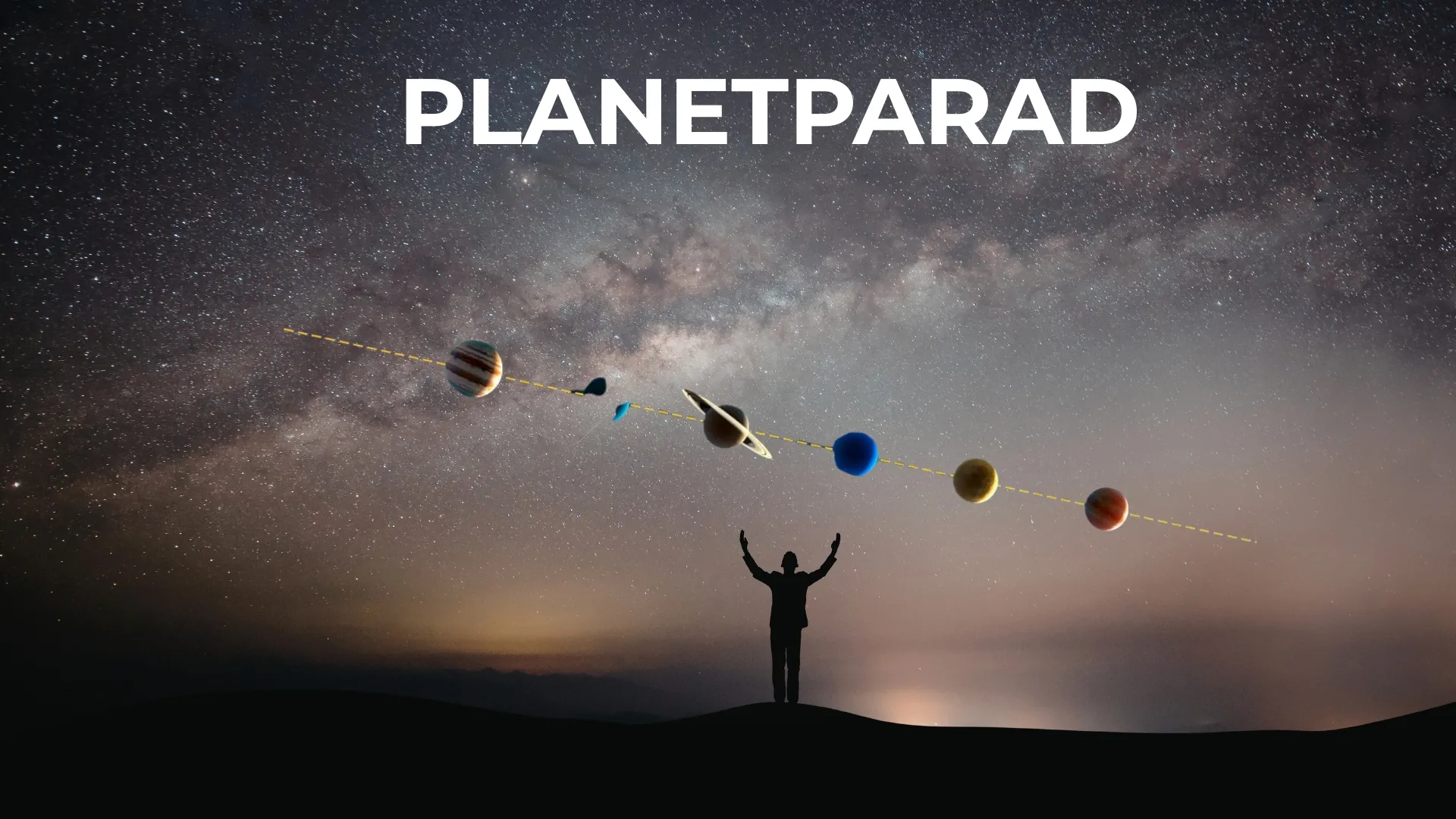 En planetparad innebär att flera planeter syns ovanför horisonten under samma kväll. Det betyder inte att planeterna står i en perfekt rak linje i rymden. Det är en synlinjeeffekt längs ekliptikan – den bana solen och planeterna följer över himlen.